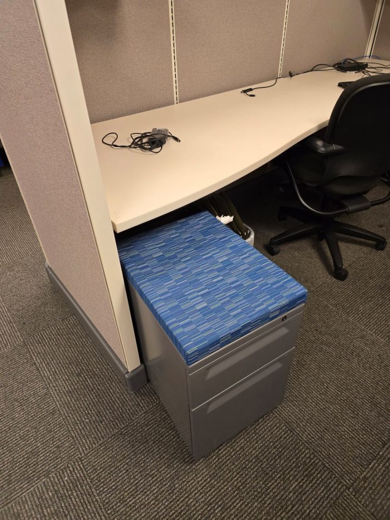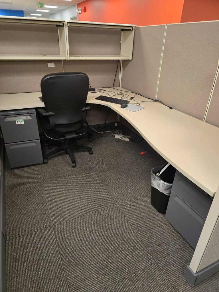 These Herman Miller AO2 cubicle have 67″ high panels, (2) 36″ overhead storage units. Locking fixed FF pedestal, mobile BF pedestal with cushion top. 24×36″ corner worksurface with 24×36 and 24×60 return worksurfaces. Cubicle power in panels with base in power feeds. Power Poles option. Good as is condition with light cleaning.