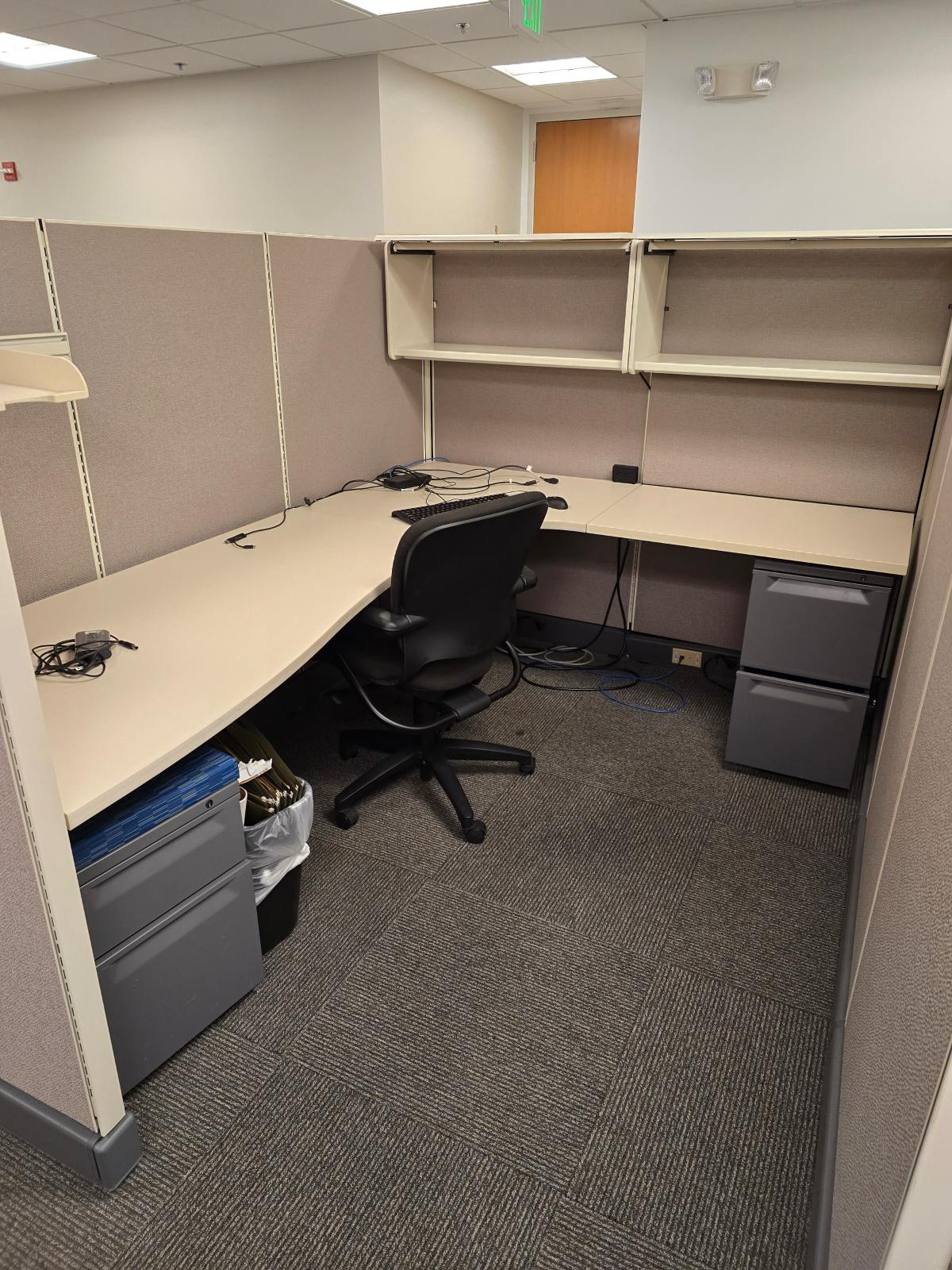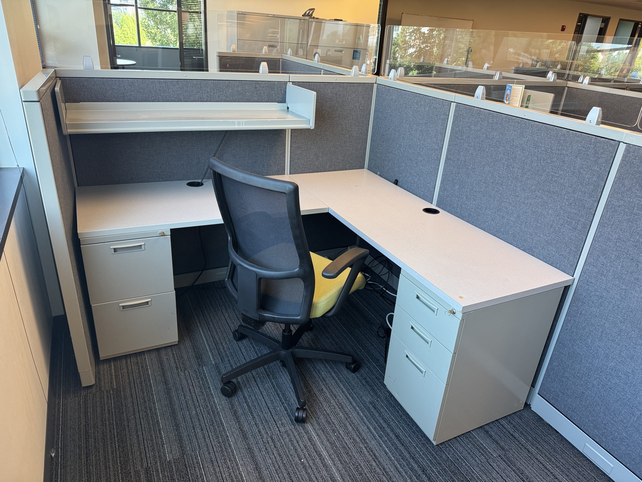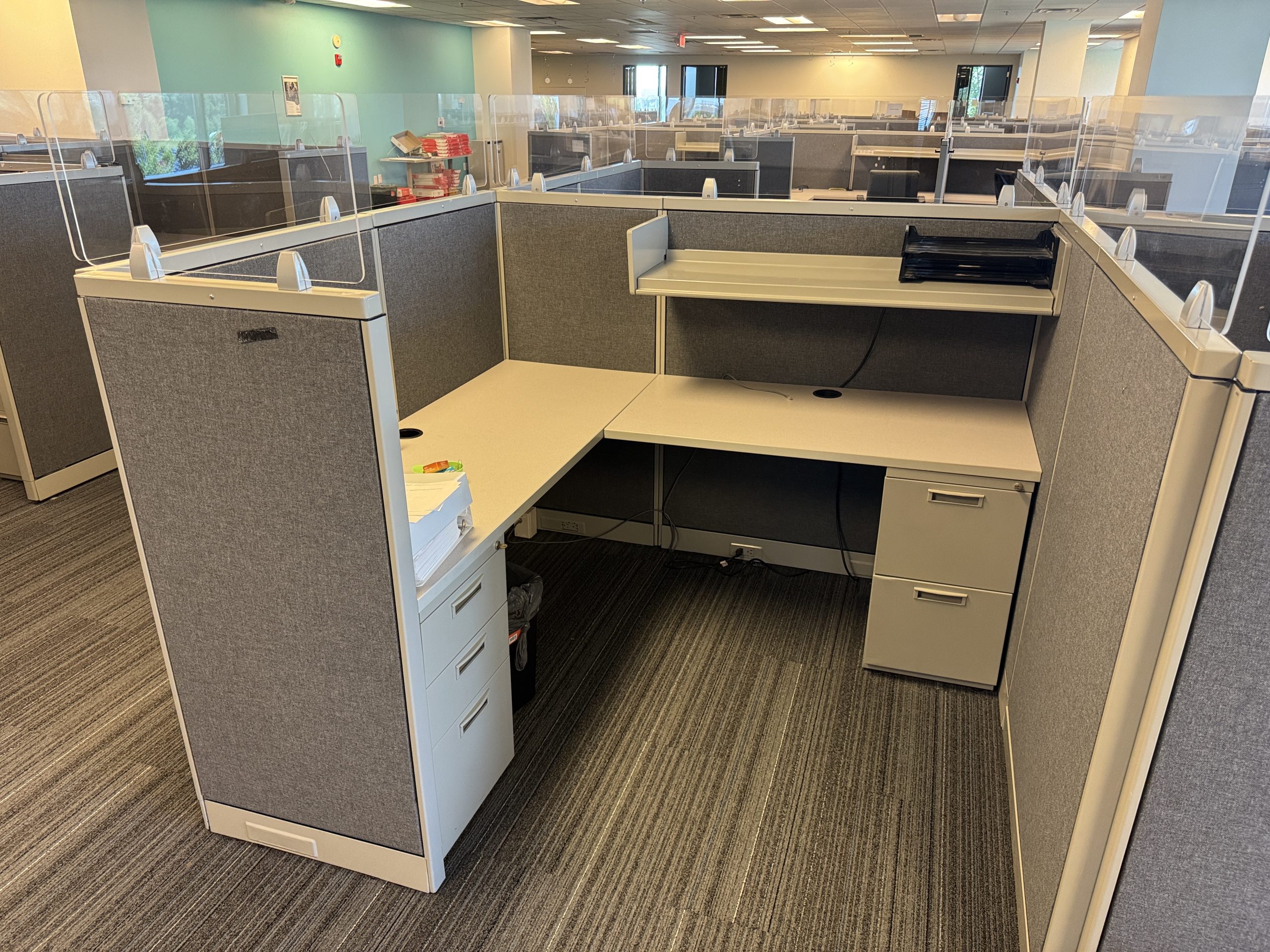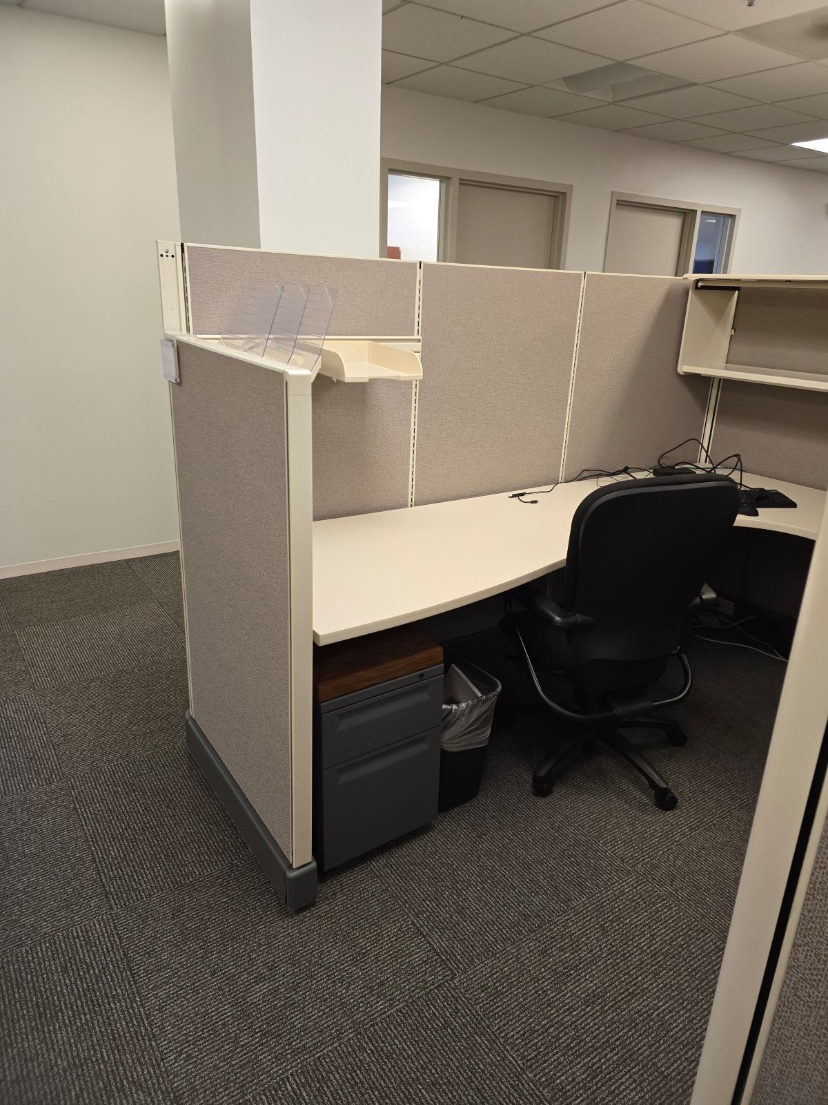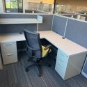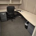 These Herman Miller AO2 cubicle have 67″ high panels, (2) 36″ overhead storage units. Locking fixed FF pedestal, mobile BF pedestal with cushion top. 24×36″ corner worksurface with 24×36 and 24×60 return worksurfaces. Cubicle power in panels with base in power feeds. Power Poles option. Good as is condition with light cleaning.