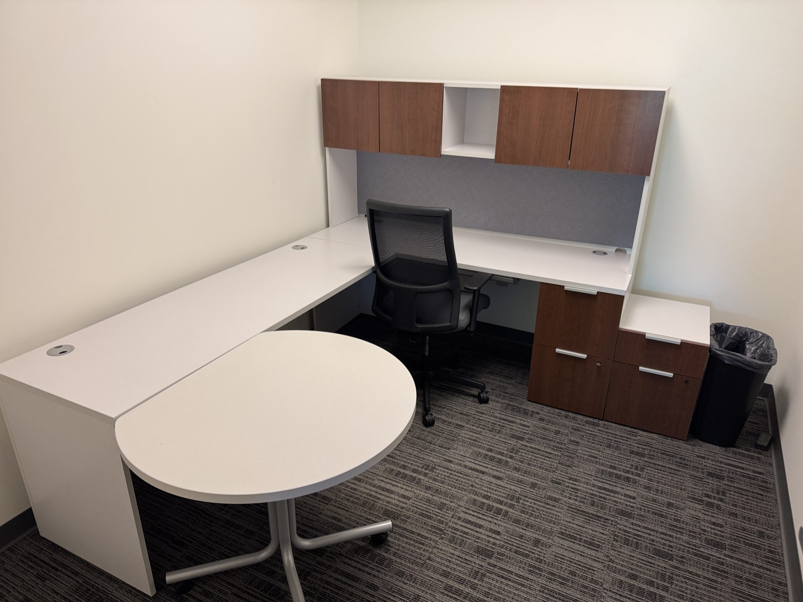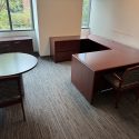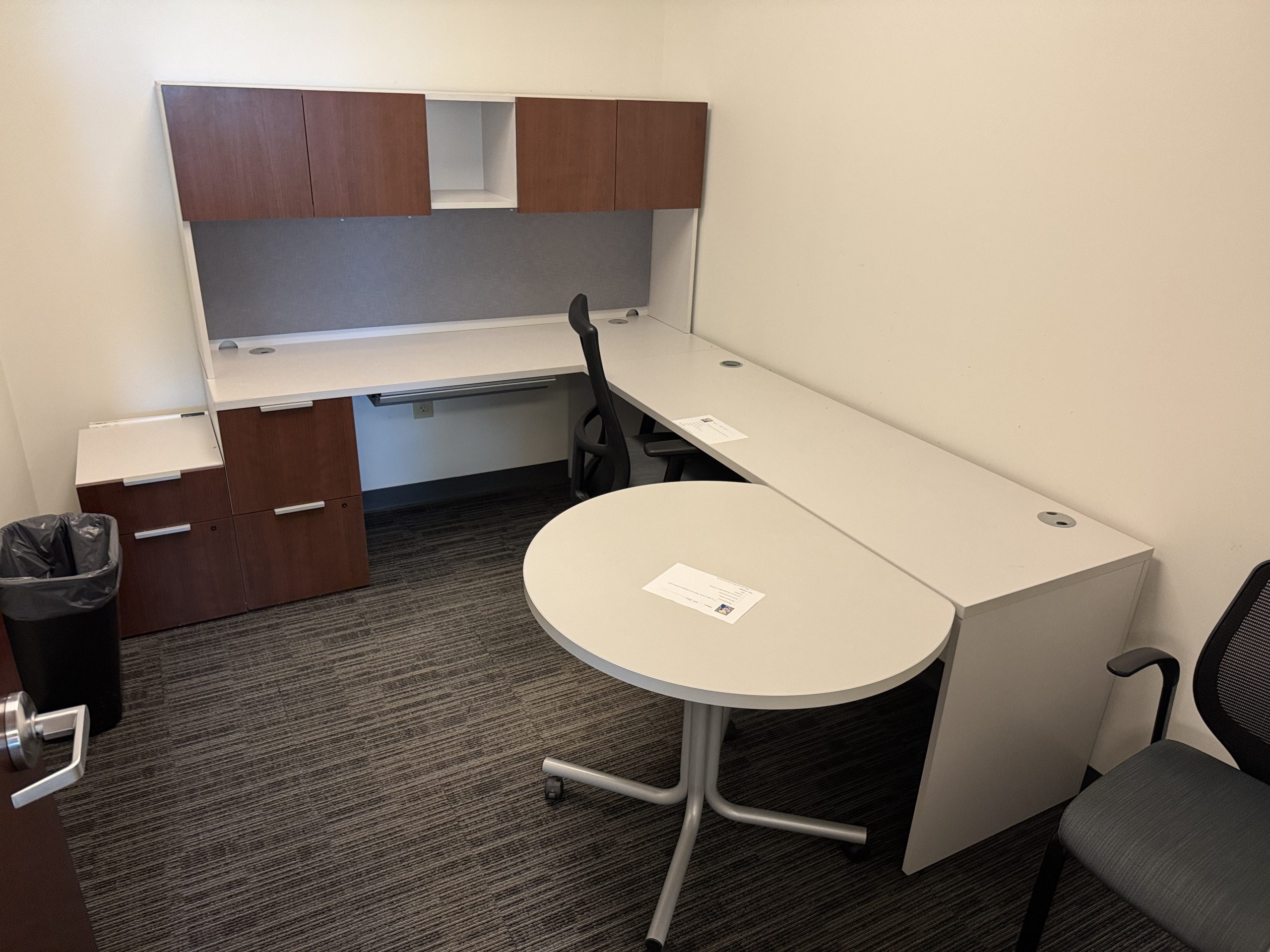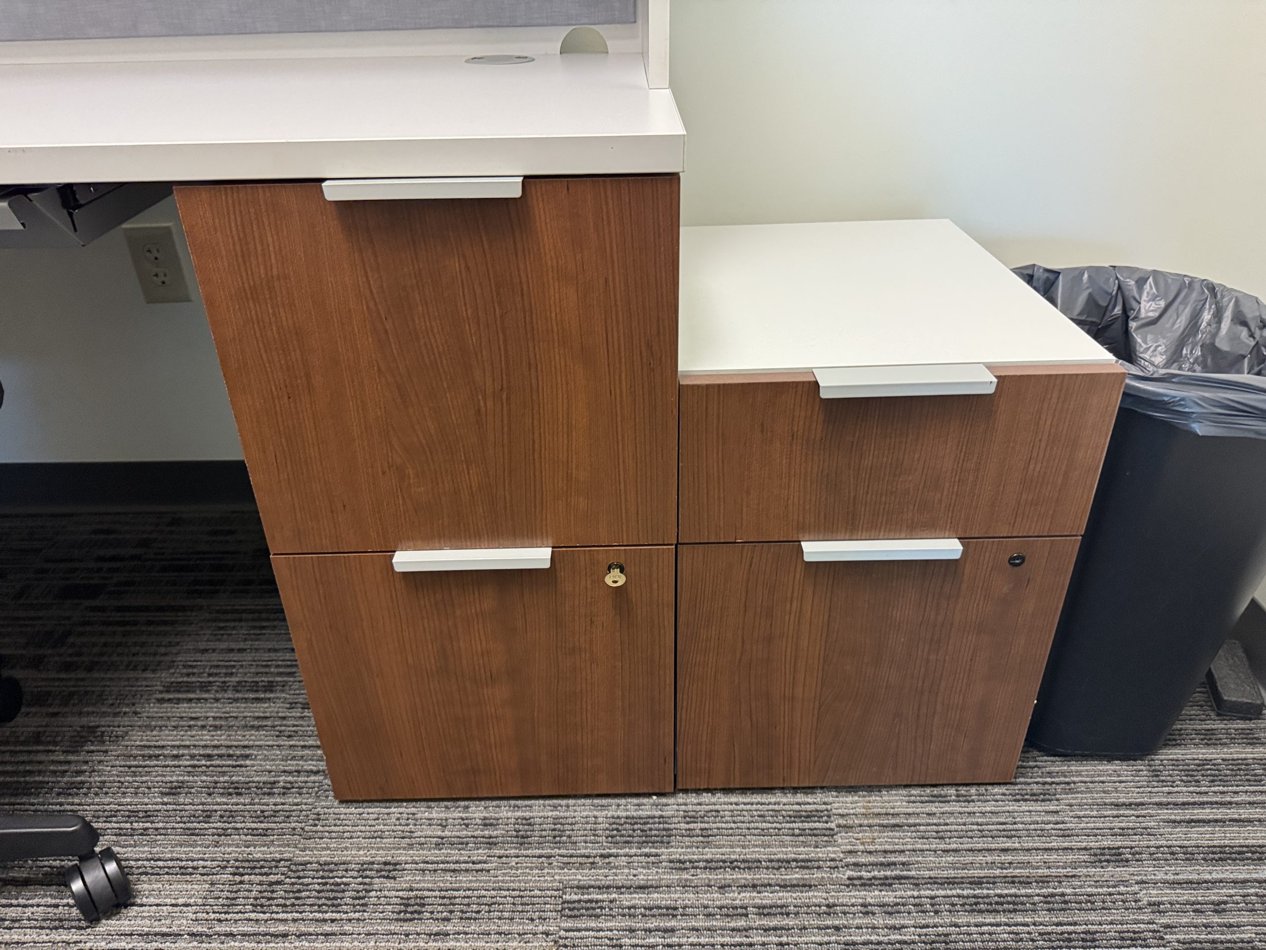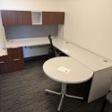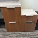 These Herman Miller AO2 cubicle have 67″ high panels, (2) 36″ overhead storage units. Locking fixed FF pedestal, mobile BF pedestal with cushion top. 24×36″ corner worksurface with 24×36 and 24×60 return worksurfaces. Cubicle power in panels with base in power feeds. Power Poles option. Good as is condition with light cleaning.