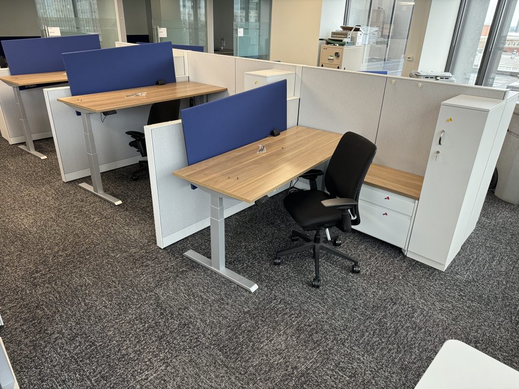 Steelcase Answer pre-owned cubicles with electronic Sit stand. Height adjustable worksurface is 30×72 with privacy screen. Low panels that support a 2-drawer lateral file and mini tower. Very Good as-is condtion. See prints below to see how cubicles were originally set-up, base-power feeds. These are new style Answer with flat top caps.