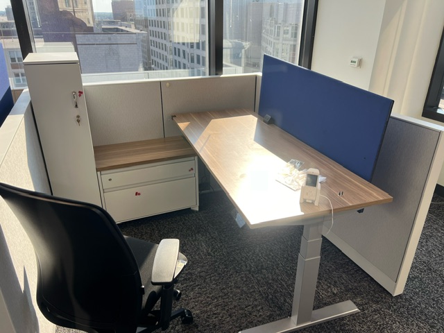 Steelcase Answer pre-owned cubicles with electronic Sit stand. Height adjustable worksurface is 30×72 with privacy screen. Low panels that support a 2-drawer lateral file and mini tower. Very Good as-is condtion. See prints below to see how cubicles were originally set-up, base-power feeds. These are new style Answer with flat top caps.